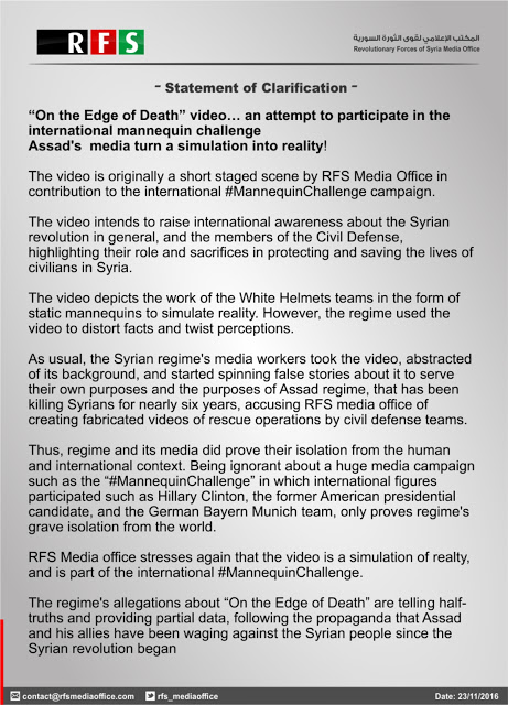 Yet on November 25, they published an article titled, “Syria’s White Helmets apologize for Mannequin Challenge video,” in which they admit: