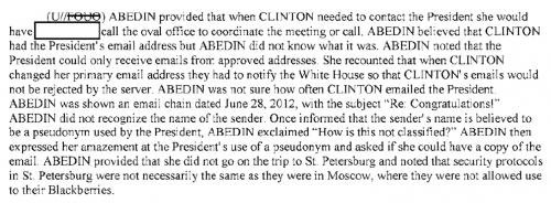 “Once informed that the sender’s name is believed to be pseudonym used by the president, Abedin exclaimed: ‘How is this not classified?'” the report says. “Abedin then expressed her amazement at the president’s use of a pseudonym and asked if she could have a copy of the email.”