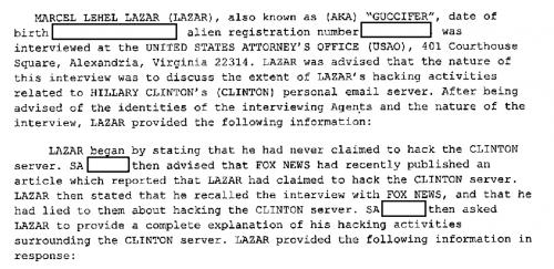 Much of the released information had already been made public. One notable exchange from the FBI’s June 7, 2016 interview with “Guccifer” supposedly confirms FBI Director Comey’s claim that Lazar falsely asserted to Fox News that he’d accessed Clinton’s server. “Lazar began by stating that he had never claimed to hack the Clinton server. [An FBI agent] then advised that Fox News had recently published an article which reported that Lazar had claimed to have to Clinton server. Lazar then stated that he recalled the interview with Fox News, and that he had lied to them about hacking the Clinton server.” It remains unclear why he would have lied.