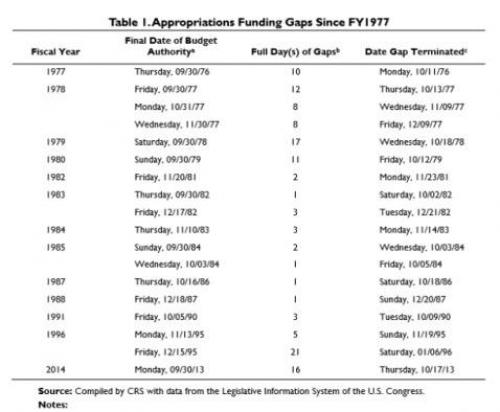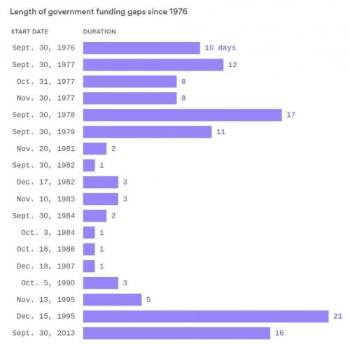 In retrospect, this is hardly a novel development, as history shows there have been 18 previous closures starting in 1976, with the last one taking place in September 2013. Almost all of the funding gaps occurred between FY1977 and FY1995. During this 19-fiscal-year period, 15 funding gaps occurred.