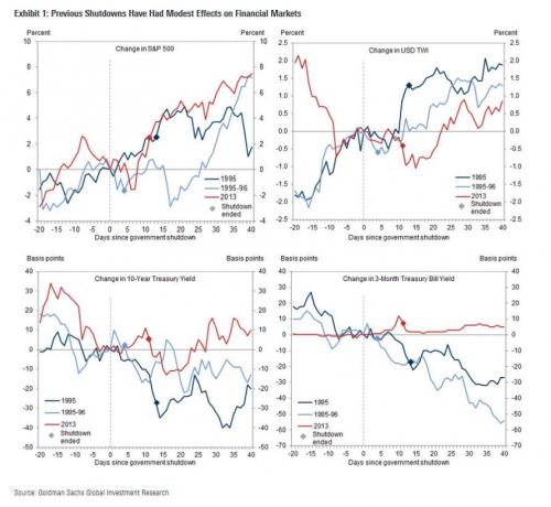 Markets have tended to shrug off shutdowns as long as the debt limit is not involved. The 1995, 1995-96, and 2013 government shutdowns had a modest effect on financial markets. The dollar weakened slightly in all three cases in the few days following each shutdown, with a further leg down in 2013 as the debt limit deadline approached. Treasury yields did not react meaningfully at the start of these shutdowns. The equity market reaction was inconsistent, with a slight decline in the early days of the December 1995 and October 2013 episodes, but no real change around the November 1995 shutdowns.
