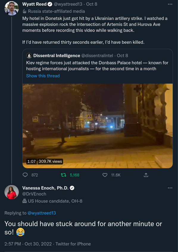 - (21) Slow News Day on Twitter: “Progressive Democrat @DrVEnoch running for Congress in Ohio openly wished death on a journalist @wyattreed13 She deleted her tweet minutes after I grabbed this https://t.co/IT8hJp50mt” / Twitter